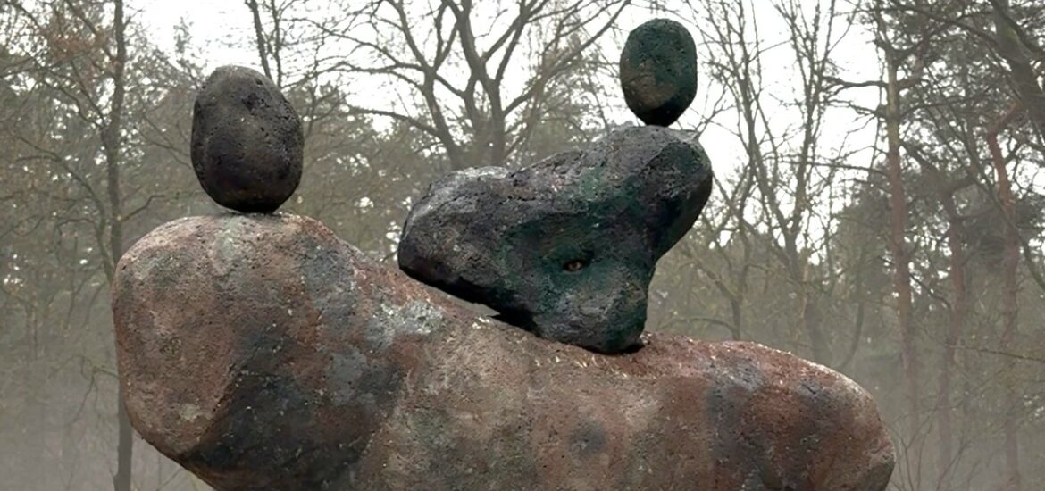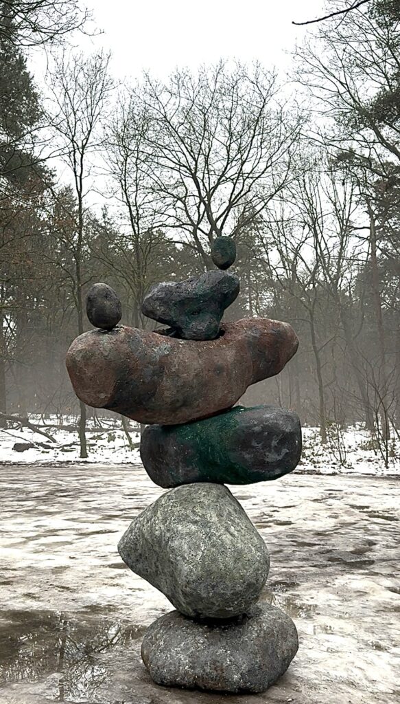 Cette sculpture s’inspire de l’art zen japonais consistant à équilibrer des pierres pour créer une sculpture.